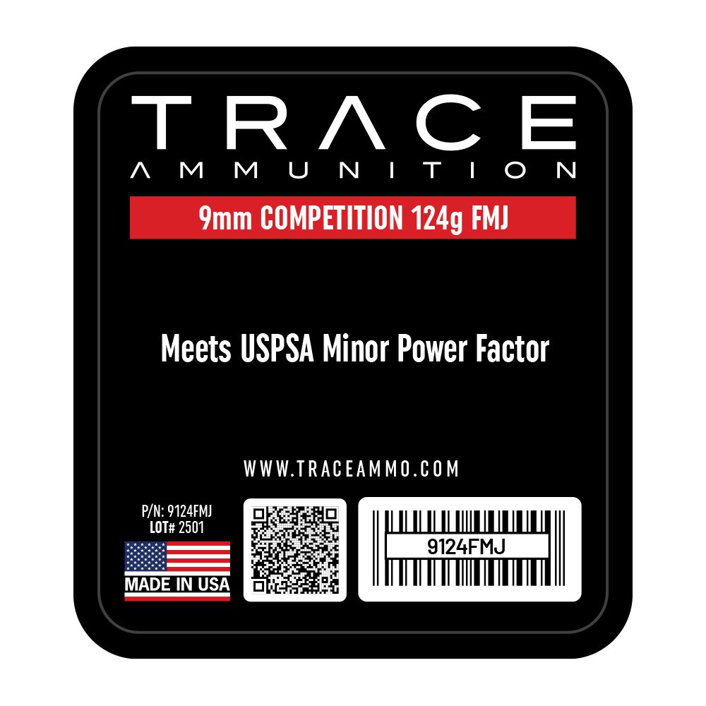TRACE COMPETITION 9mm meets the demands of both the competitive shooter and the shooter who only wants the best for their firearm and shooting experience. Pairing the industries cleanest burning powder with an extremely accurate 124g jacketed projectile running at 1050 fps, TRACE Competition 9mm offers an unparalleled accuracy, soft recoil, and an extremely clean burn. Whether you are competition shooter needing match quality ammunition that meets USPSA Minor Power Factor, or you are the type of shooter that demands the best, TRACE COMPETITION 9mm has got you covered!